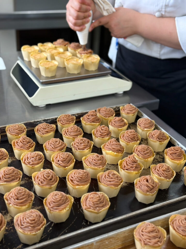 アーモンドケーキの中に渋皮煮の栗を入れ、上から栗と白餡を合わせたペーストを絞って焼き上げました。