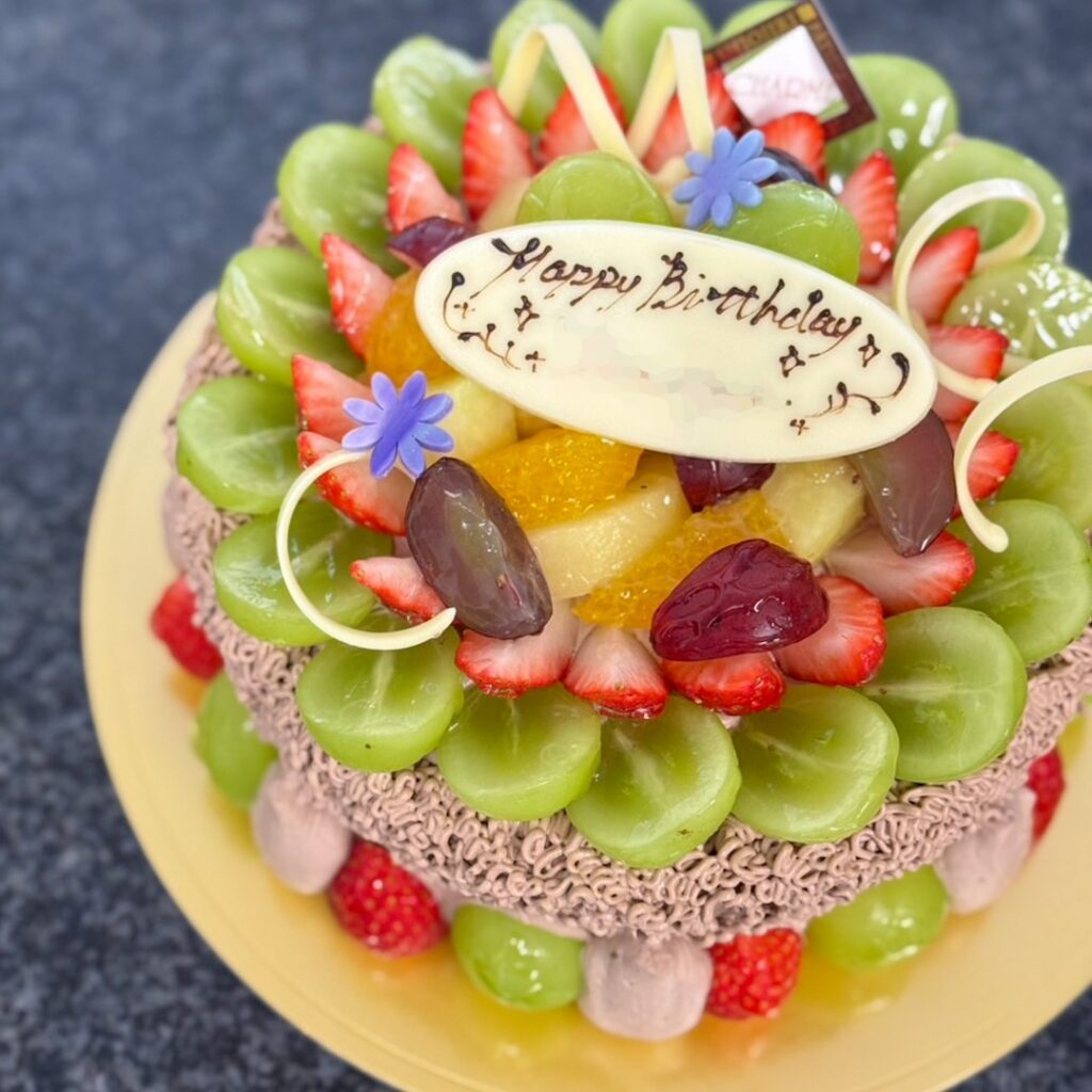 【生チョコクリーム5号】+フルーツ増量_#A2182 2025.11.012025.10.22 ▲生チョコクリーム5号+フルーツ増量(シャインマスカット多め) シャインマスカットが多めのフルーツ増量仕上げでご注文いただきました。葡萄の季節限定です。 ※側面のデコレーションは、ご希望で承ります。