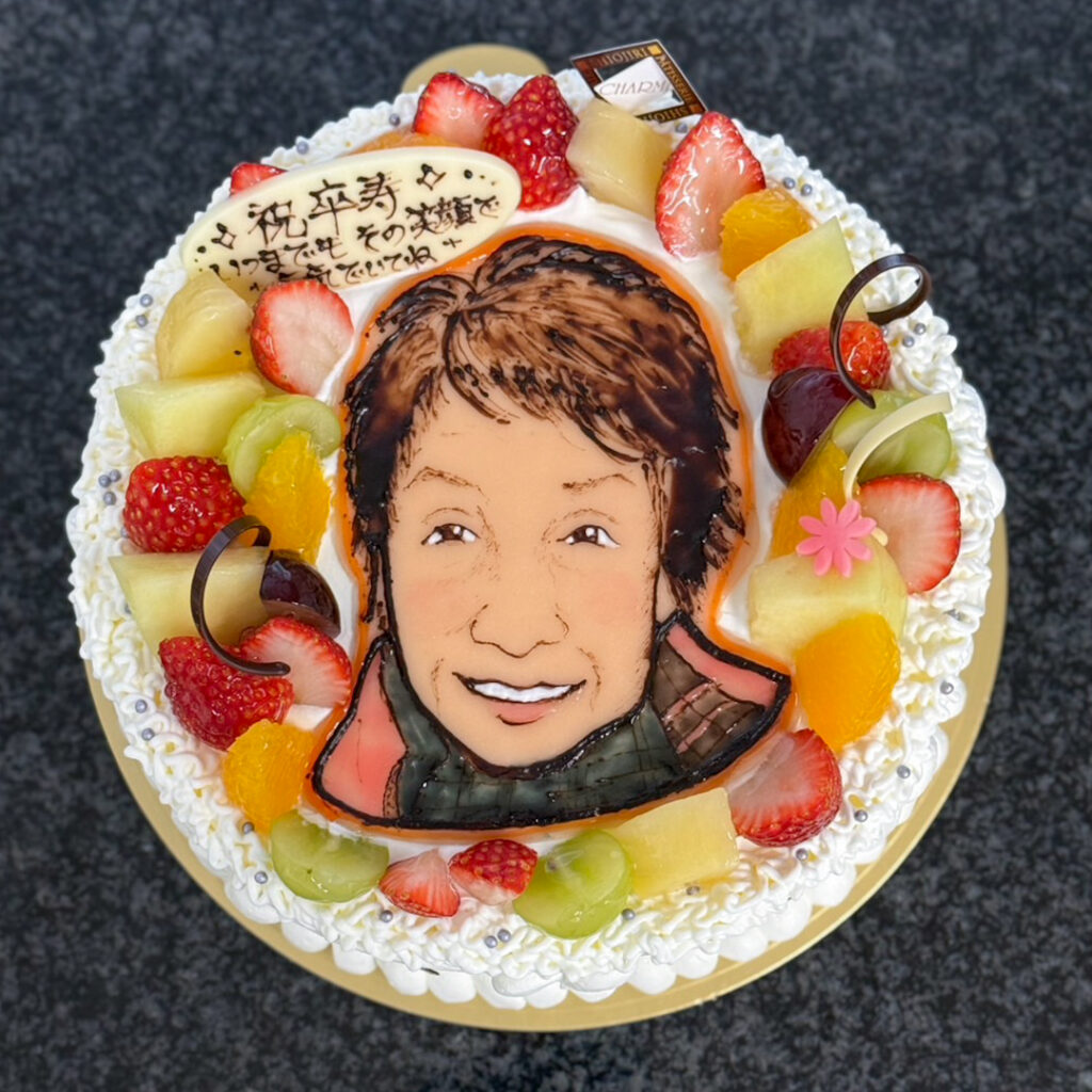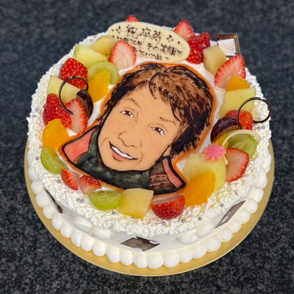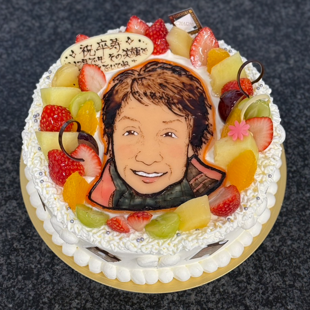 デザインオーダーケーキ(手描き)_#D2224 2025.11.212025.11.19 ▲生クリーム7号手描きイラスト仕上げ 卒寿のお祝いに、似顔絵ケーキのご依頼をいただきました。メッセージプレートにも書かせていただきましたが、本当に素敵な笑顔です✨️ ※似顔絵をご希望の場合は、顔がはっきりとわかる、お写真かデータ(店頭にてメール受信可)をご用意くださいませ。