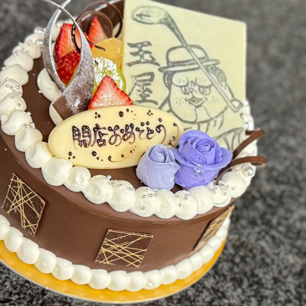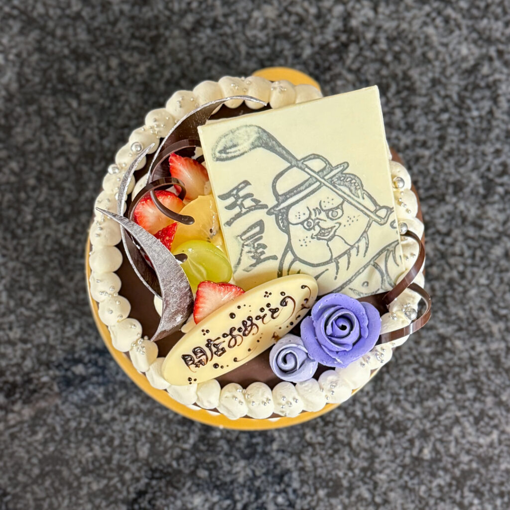 デザインオーダーケーキ(プリント)_#D2284 2025.12.012025.11.26 ▲生クリーム5号プリント仕上げ(持ち込みイラスト原稿)+チョココーティング+バラ中小各1コ 大切な方のお祝いに。バースデー以外にも色んなお祝いにオーダーケーキを。 イラストやお写真を、食べられる素材でホワイトチョコシートに加工します。