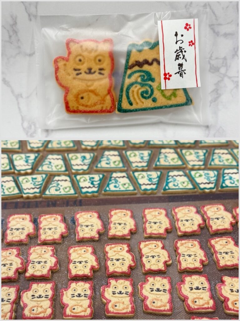 お正月クッキー 2025.12.302025.12.28 【お正月クッキー】数量限定・期間限定2枚入り ¥290 招き猫・富士山の2種入、お正月用デザインクッキーが登場🗻 完全ハンドメイドで描いたイラストは、様々な表情があって可愛いです。新年のご挨拶にぴったり。 シンプルなシュガークッキーですので、幅広い方に召し上がっていただけると思います✨️ 数量、期間限定販売です。 ギフト BOXに同梱できますので、お気軽にお声掛けくださいませ。 <期間限定>お正月