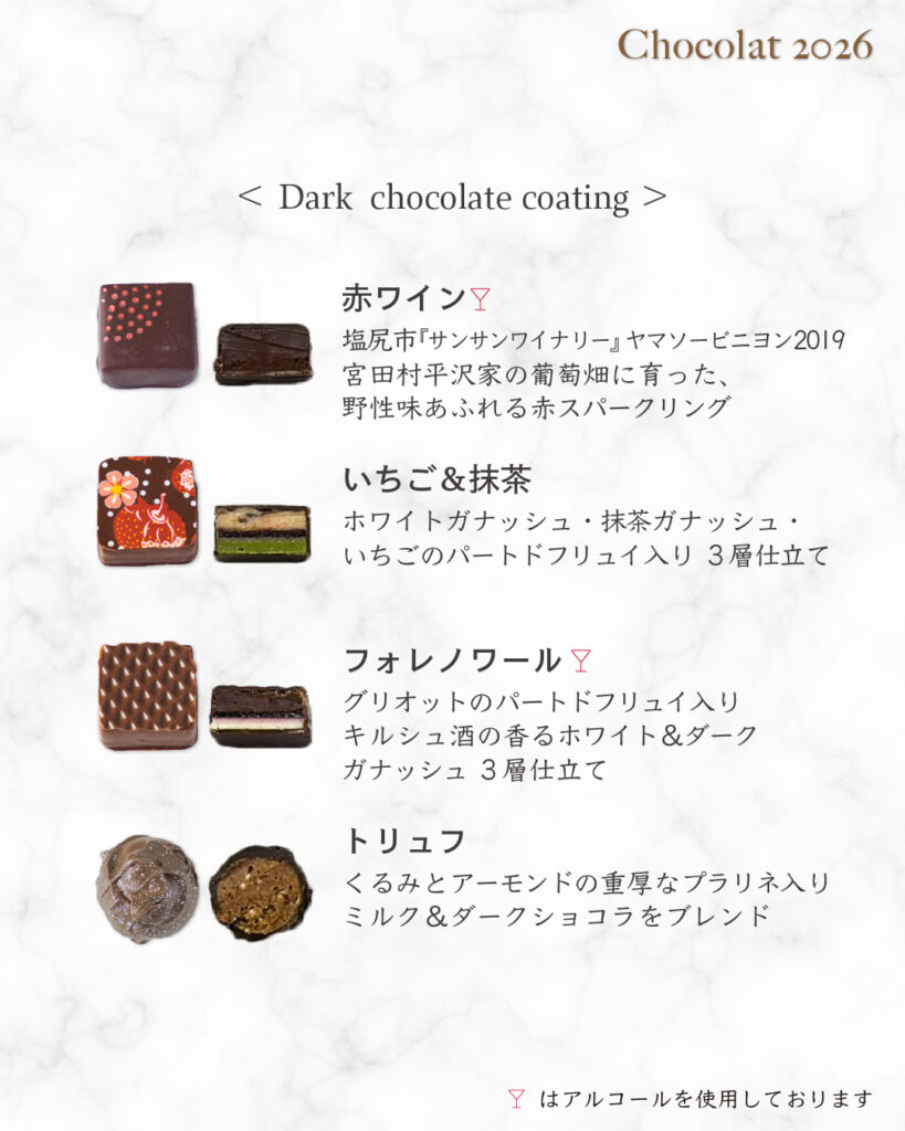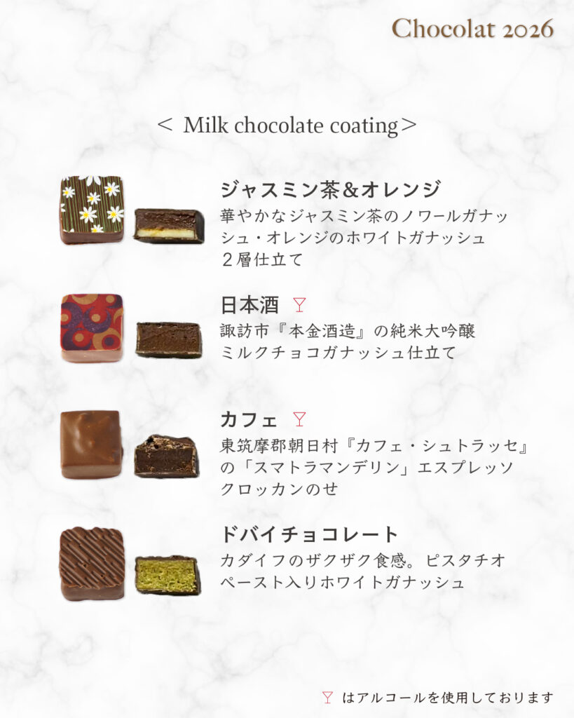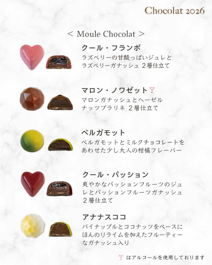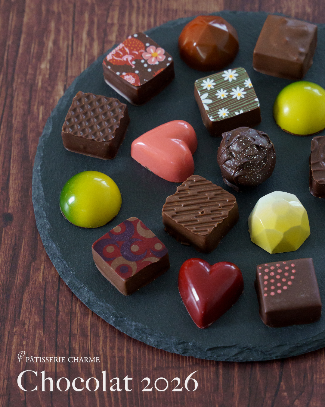 今年は13種のボンボンショコラ(トリュフ含む)と、オランジェット、すでに販売中のマカダミアショコラとカカオビーンズショコラの全16種類のフレーバーをご用意しました。