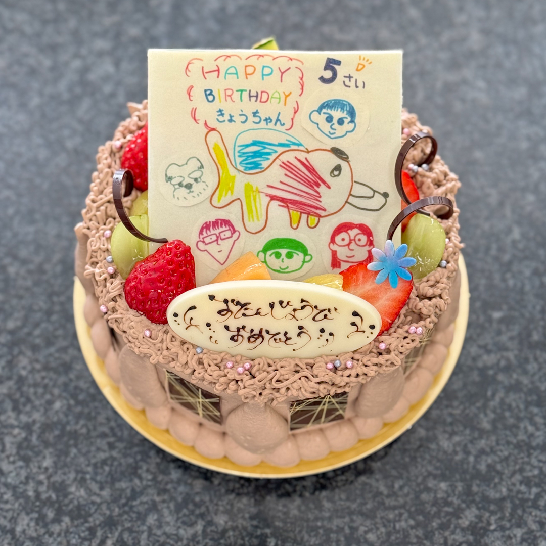 デザインオーダーケーキ(プリント)_#D2446 2026.01.192026.01.18 ▲生チョコクリーム5号プリント仕上げ(持ち込みイラスト原稿) お子様の描いた素敵なイラストをプリントした、ホワイトチョコレートを乗せたケーキです。ご家族様の笑顔溢れる記念日になりますね✨️ イラストやお写真を、食べられる素材でホワイトチョコシートに加工します。