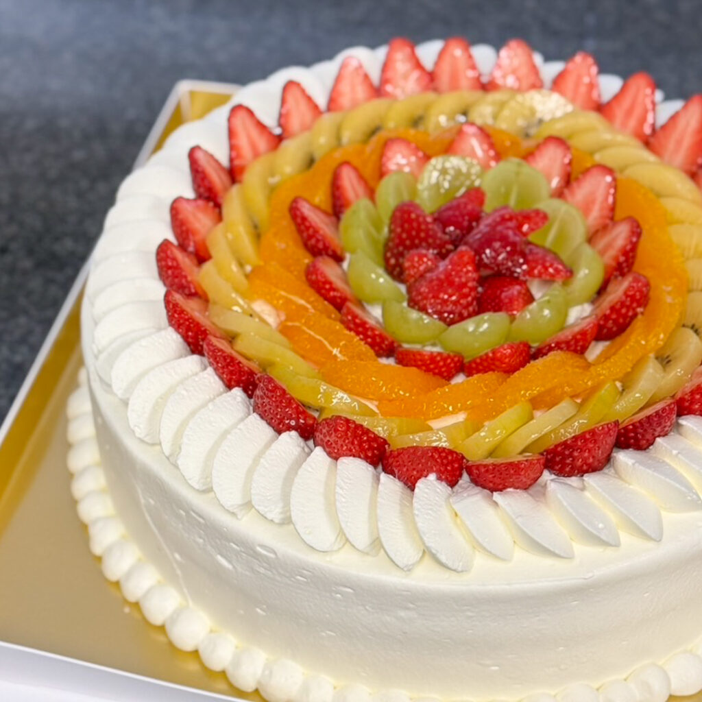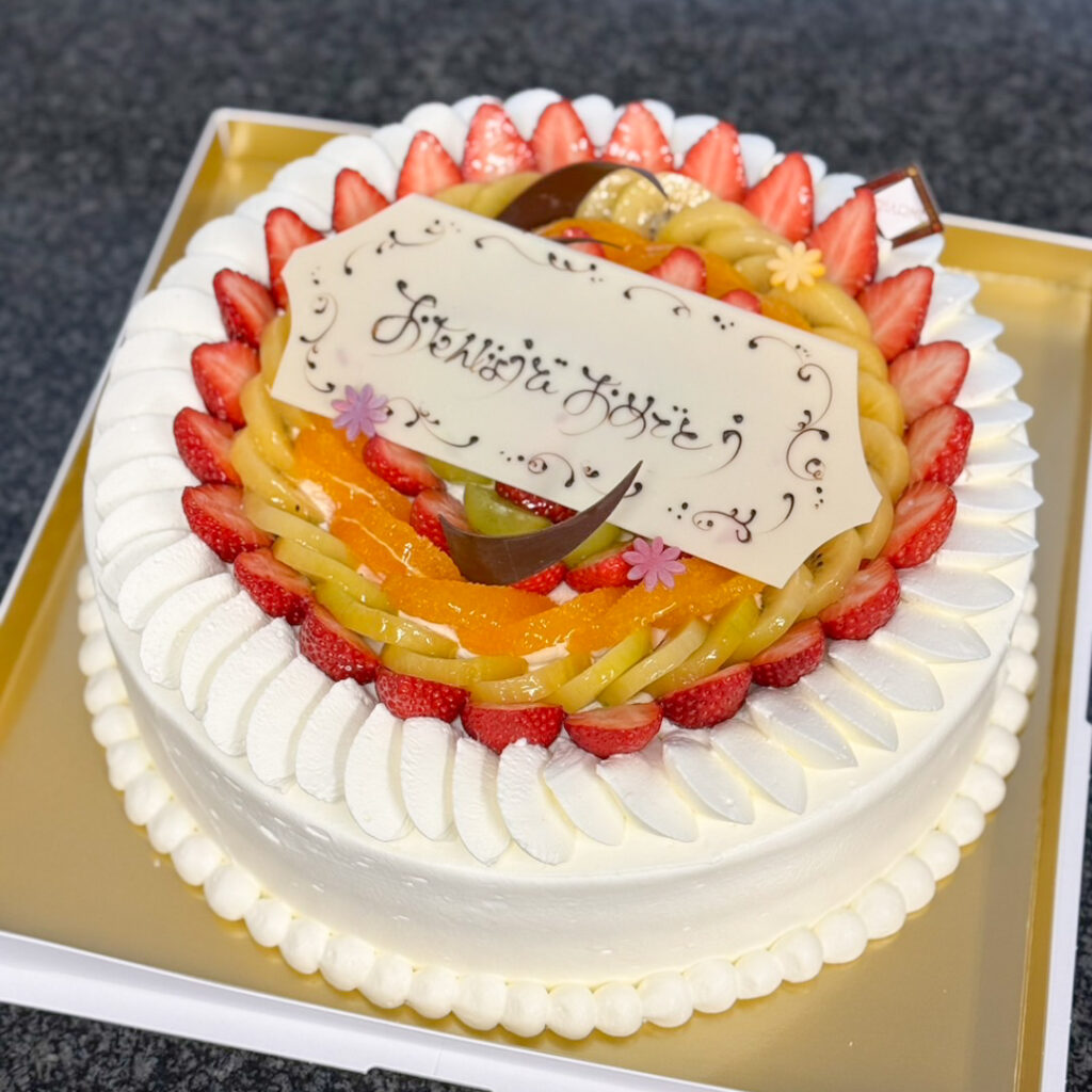 【生クリーム10号】デコレーションケーキ_#A2452 2026.01.292026.01.23 ▲生クリーム10号+フルーツ増量 当店の定番ケーキ、最大サイズの10号です。常時箱のご用意があるのがこのサイズまで。それ以上は、お箱準備に時間がかかるため、最短10日前までにご予約をお願いしております。 ※既製品箱がないサイズの場合、箱のオーダーメイド製作のため、2週間〜4週間程度お時間がかかる場合がございます。 ※デザインはイメージです。入荷のフルーツ種類(季節に応じる)により変わります。