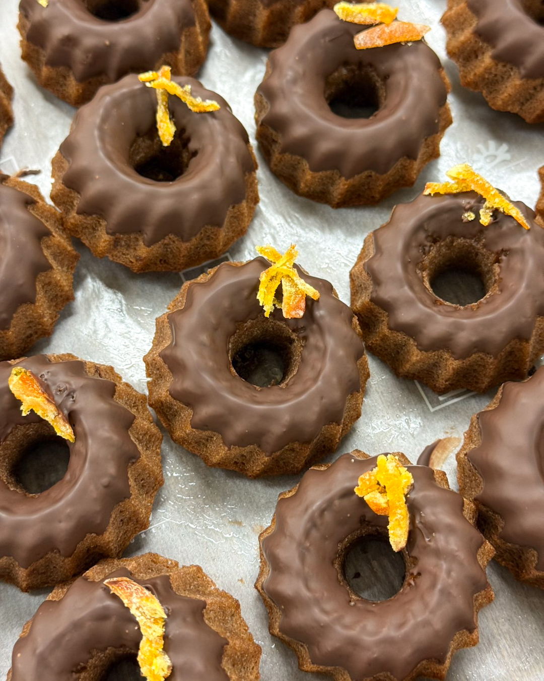 クグロフ・ショコラ 2026.01.232026.01.20 【クグロフ・ショコラ】¥300 ネーブルオレンジ&ココア入りマドレーヌ生地をクグロフ型で焼き上げ、「グリーンカカオ」※1 と清見オレンジのセミドライピールでデコレーションしました🍊 力強いカカオの味わいとフルーティーな酸味をお楽しみいただけます💕 ※1「グリーンカカオ」は、農業と林業を組み合わせた未来につながるサステナブルな農業方法栽培された、ブラジルトメアス産カカオを使用したカカオ分62%のチョコレートです。 <期間限定>