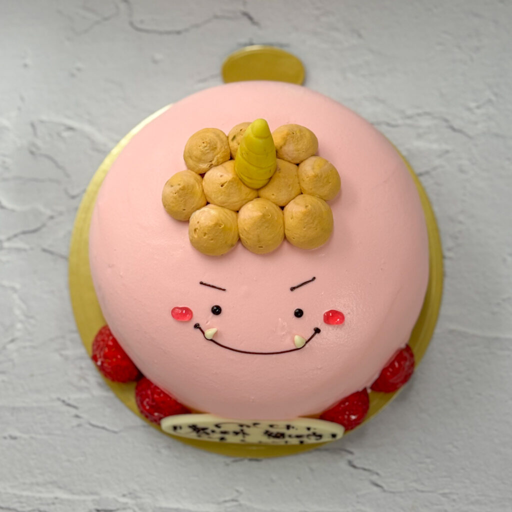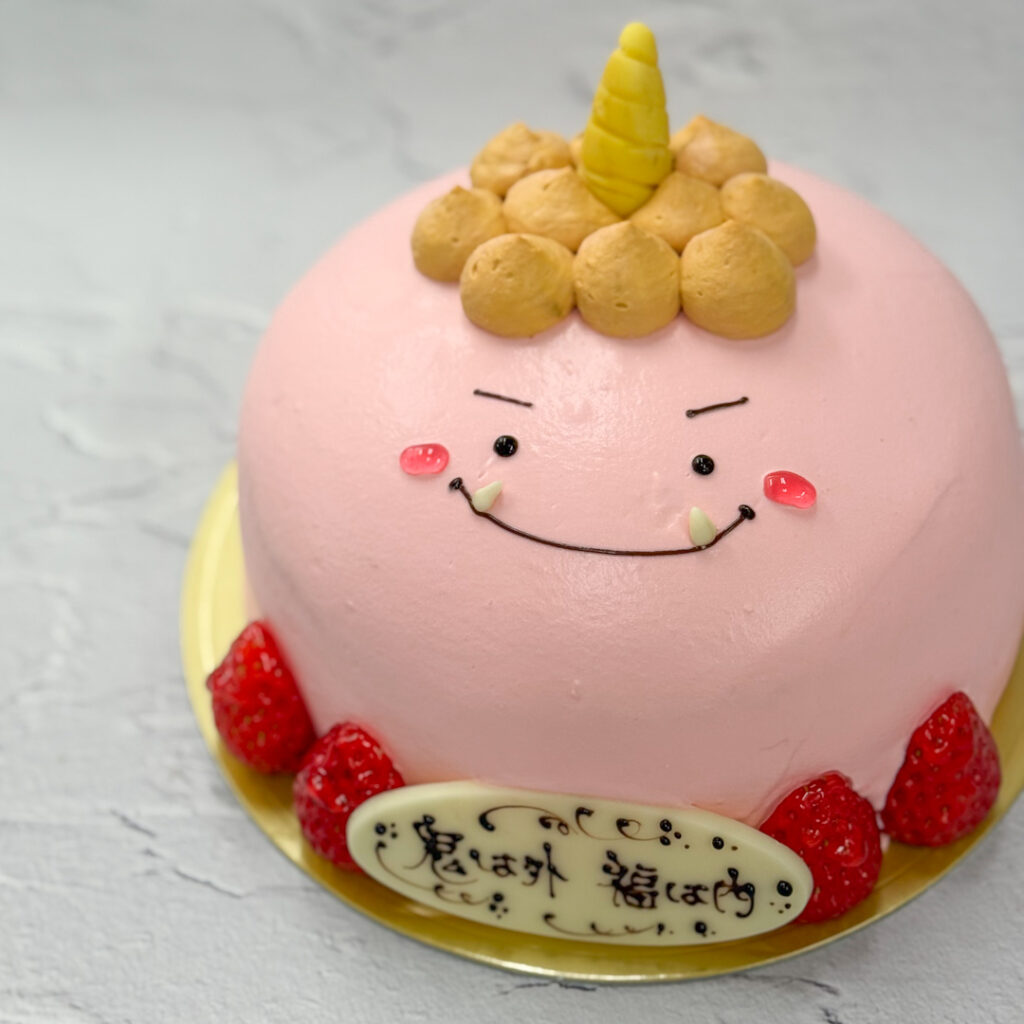 赤鬼さんケーキ_節分2026 2026.02.042026.01.30 塩尻産紅ほっぺをサンドし、色付けした純生クリームでコーティングします。 ※画像は5号です。 ●4号¥3,500(2-3名)●5号¥4,900(4-6名)●6号¥6,100(6-8名) <期間限定>2026 節分の日