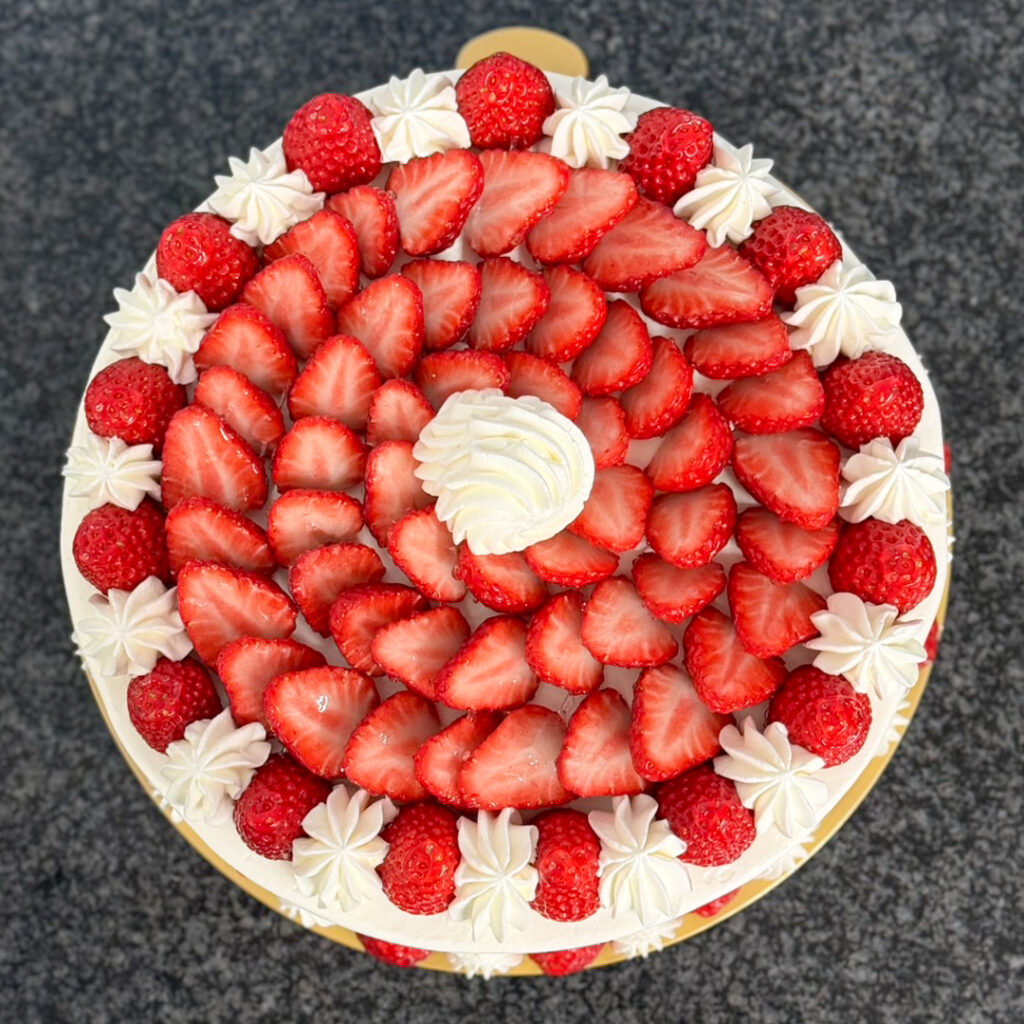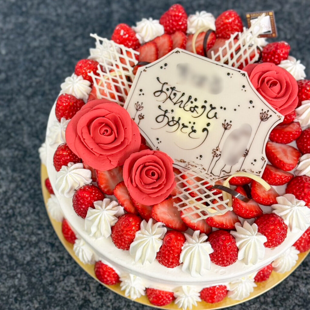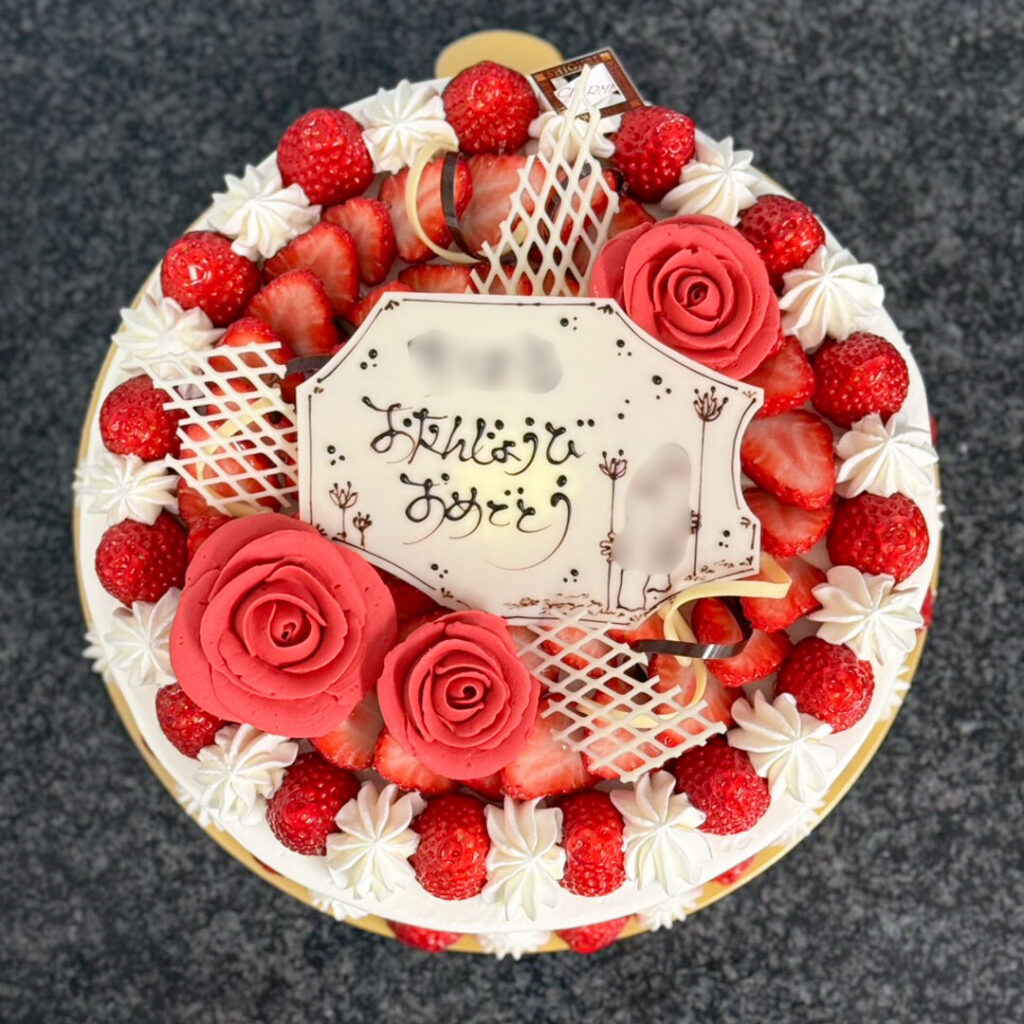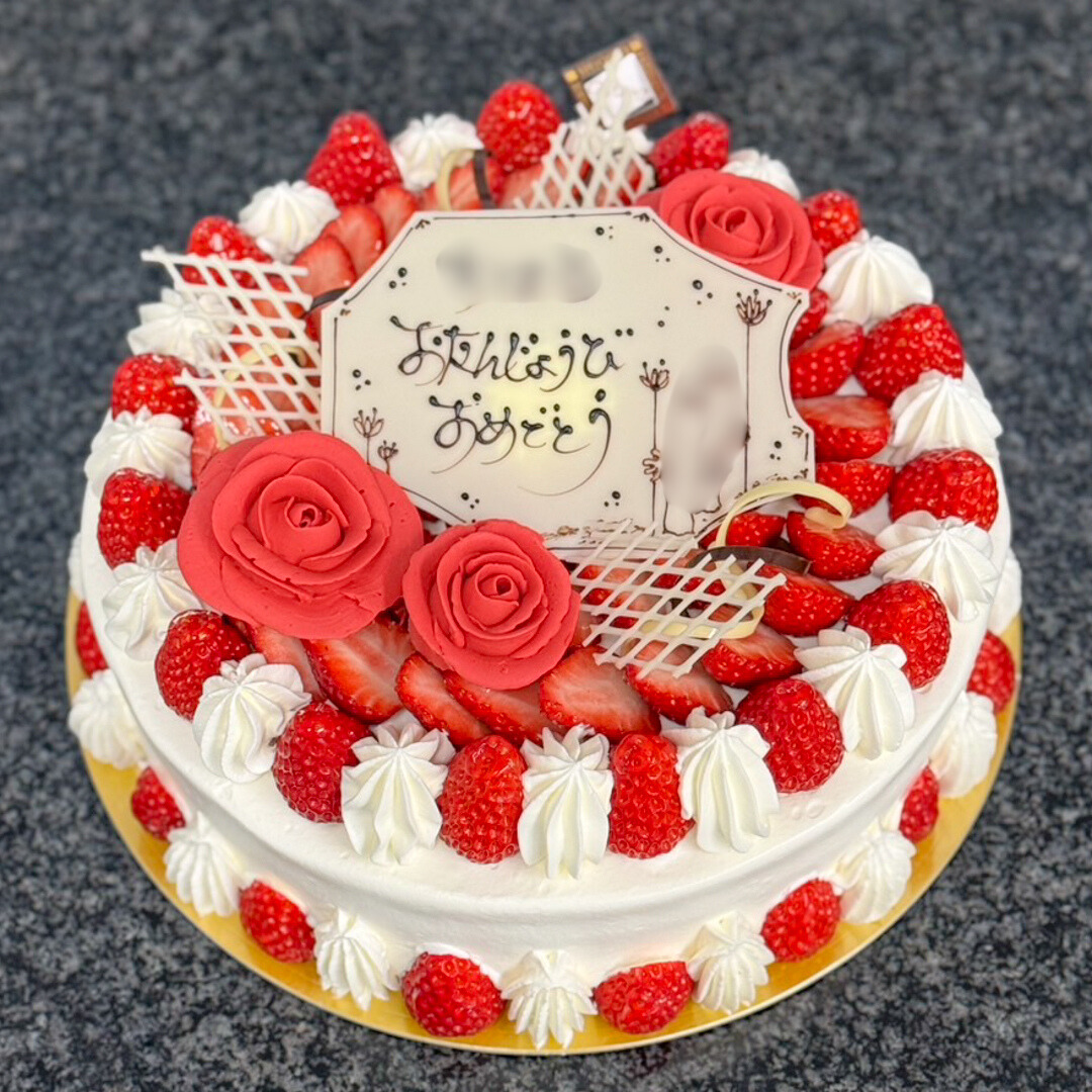 【生クリーム8号】いちごたっぷり_#A2640 2026.02.28 ▲生クリーム8号+いちごのみ&増量+大きめバラ3個 トッピングだけで60粒以上のいちごを使用しました。※いちごの少ない時期(特に夏季〜秋)は受付不可です。