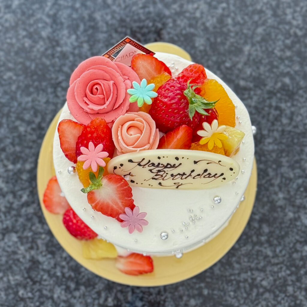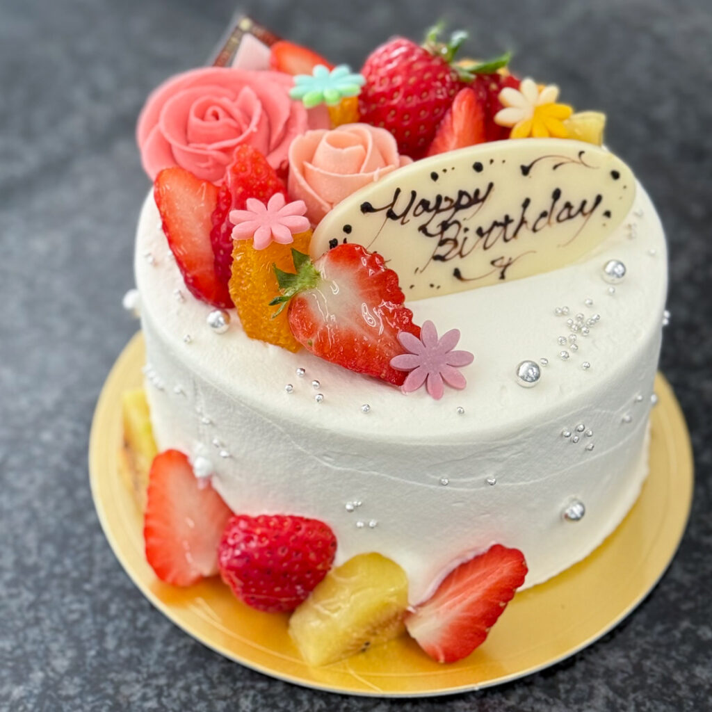 【生クリーム4号】バラトッピング_#A2678 2026.03.292026.03.27 ▲生クリーム4号+バタークリームのバラ+チョコ細工の花 バタークリームのバラや、カラフルなチョコ細工のお花で華やかです。こぼれたフルーツがポイントです。