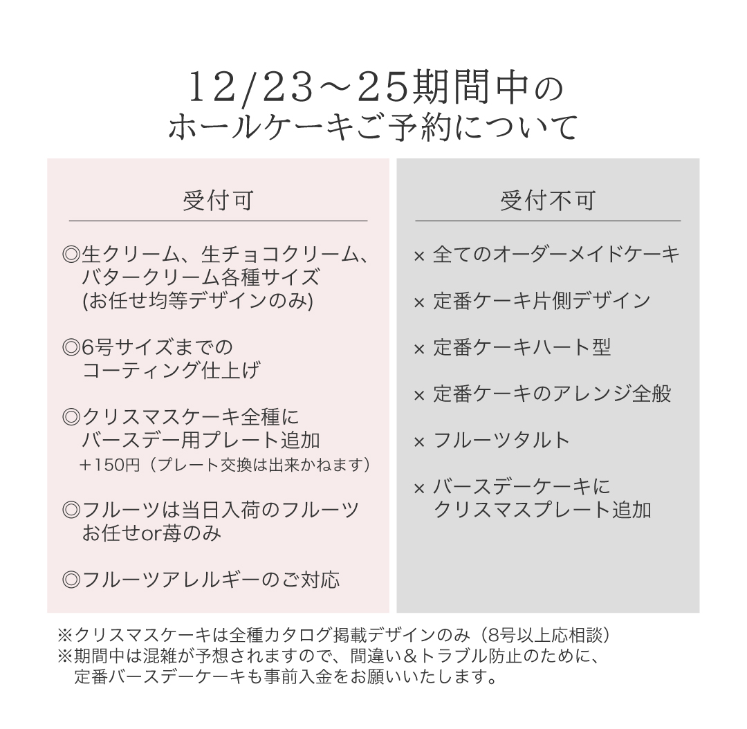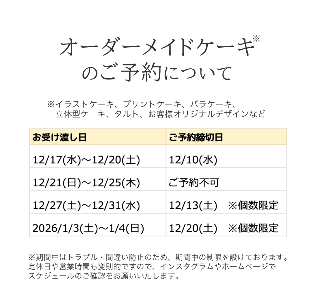 ⚠︎クリスマス期間(※)のオーダーメイドケーキの製造はできかねます。ご予約受付できませんので、ご了承くださいませ。